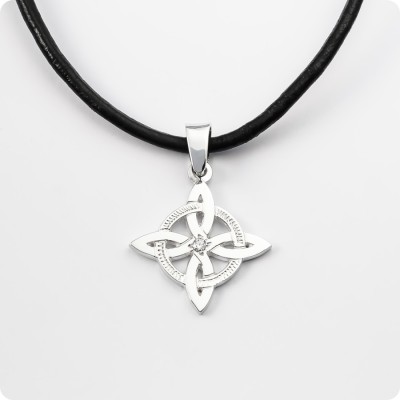 Кельтский четырехлистник выпилен из цельной серебряной пластины, затем штихелем (это такая ювелирная стамеска ) была нанесена гравировка - что придало этому Кельтскому украшению изящный вид и дополнительный объем. После чего, мы с ювелирной точностью вставили в центр Четырехлистника фианит. Чтобы придать камню дополнительный блеск под ним просверлили маленькое сквозное отверстие в металле. Теперь фианит блестит и переливается на свету подобно маленькой яркой звездочке.